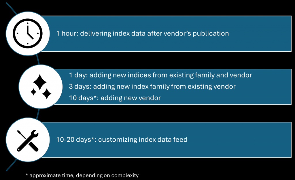 Whether it’s the daily provision of index data, the acquisition of new indices, or the setup of client-specific customizations, our cutting-edge technology and expert team consistently exceed your expectations.